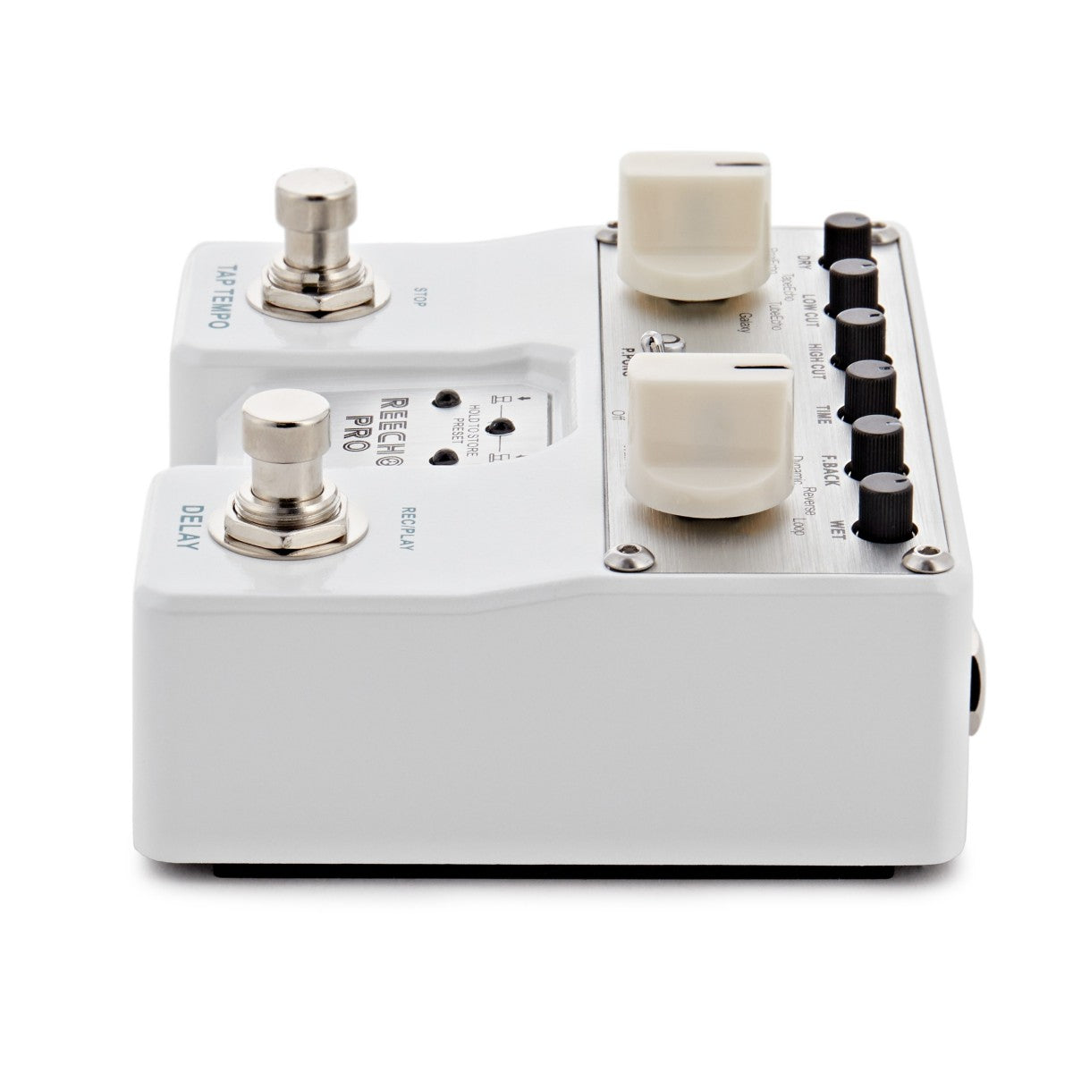 Với nhiều loại điều khiển, ReeCho Pro Twin Delay Pedal mang đến tính linh hoạt đáng kinh ngạc trên một loạt các hiệu ứng và định hình âm sắc hơn nữa. Có một cặp bộ chọn xoay cho Loại trễ và Loại hiệu ứng, cũng như một cặp công tắc chân để kích hoạt Tap Tempo và Độ trễ. Các điều khiển của ReeCho bao gồm Khô để điều chỉnh âm lượng của tín hiệu không bị ảnh hưởng; Ướt cho phép bạn thay đổi mức hiệu ứng trễ; Cắt thấp để thay đổi tần số thấp của độ trễ và Cắt cao để điều chỉnh tần số cao. Có một điều khiển Thời gian để thiết lập lượng thời gian trễ, trong khi F.Back điều khiển lượng phản hồi từ hiệu ứng và cuối cùng là công tắc Ping Pong độc đáo cho phép bạn thay đổi lặp lại từ đầu ra bên trái và bên phải để có hiệu ứng âm thanh nổi rộng và Công tắc Bật/Tắt Trail để cắt lặp lại hoặc cho phép chúng suy giảm trong thời gian dài hơn.