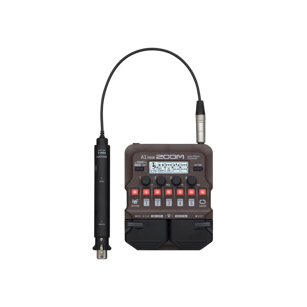 ZOOM Guitar Lab là phần mềm miễn phí cho phép bạn tùy chỉnh hiệu ứng bằng máy tính xách tay hoặc máy tính. Sau đó, bạn có thể đặt chúng vào A1 Four của mình qua USB. Bộ lặp tích hợp, cho phép ghi âm lên đến 30 giây, nghĩa là bạn có thể tạo toàn bộ phông nền cho nhạc cụ của mình. Kết hợp điều này với 68 mẫu trống và bạn đã có cho mình một ban nhạc. Công nghệ chống phản hồi giúp tất cả những điều này trở nên khả thi trong khi giảm tần số có khả năng gây ra phản hồi.